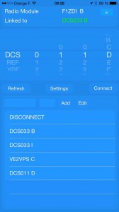 - Ensuite l’application est très simple à utiliser, elle vous permet de connecter directement des DCS, REF, et XRF à partir des molettes et d’enregistrer des connections prédéfinies comme dans mon cas pour F1ZDI. Il est à noter que si votre relais possède plusieurs modules, comme F1ZDI (F1ZDI__B et F1ZDI__C) vous pouvez sélectionner le module à connecter en cliquant sur le signe « = » en haut à droite de l’écran, à droite de F1ZDI B.